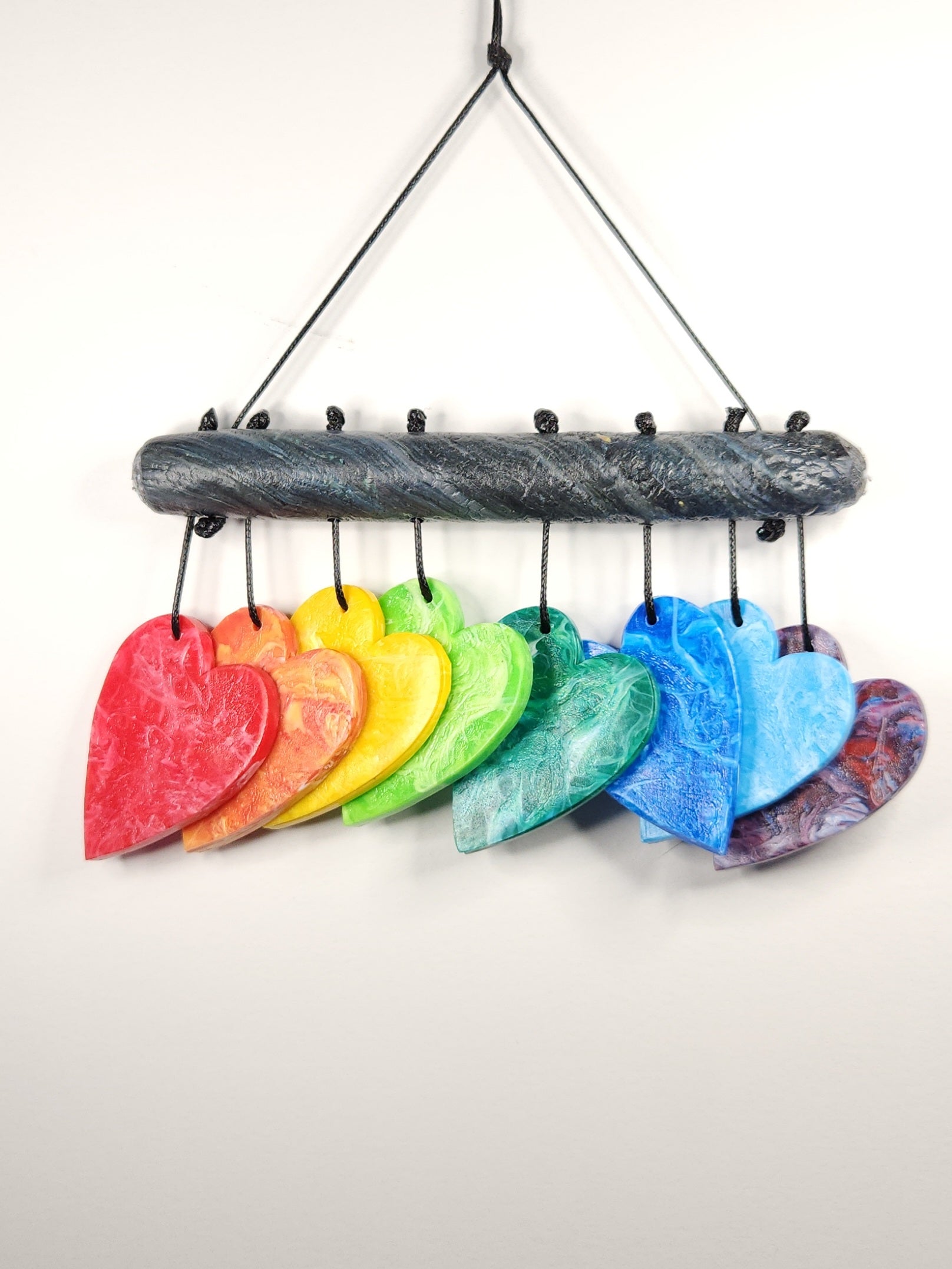 Choose between 8 or 15 small vibrant hearts in classic rainbow order, all dangling from sticks made from repurposed plastic waste. Stick colours are varying shades of black depending on what's been rescued lately!